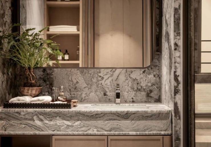 更耐用的细节 :比如在主卧背景墙上使用了 胡桃木和带有贝母光泽的装饰 ,在淋浴房用了 水云纱石材 ,这些细节都在默默提升着日常生活的质感。