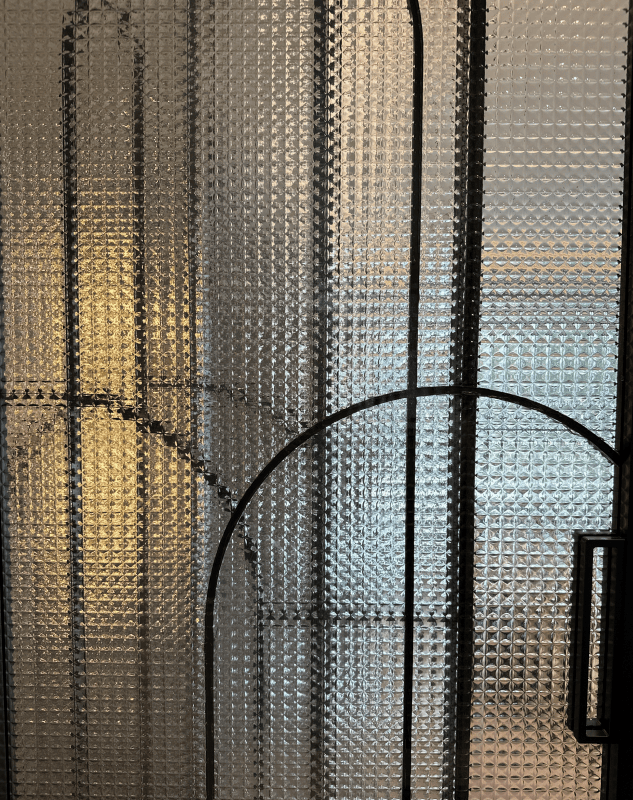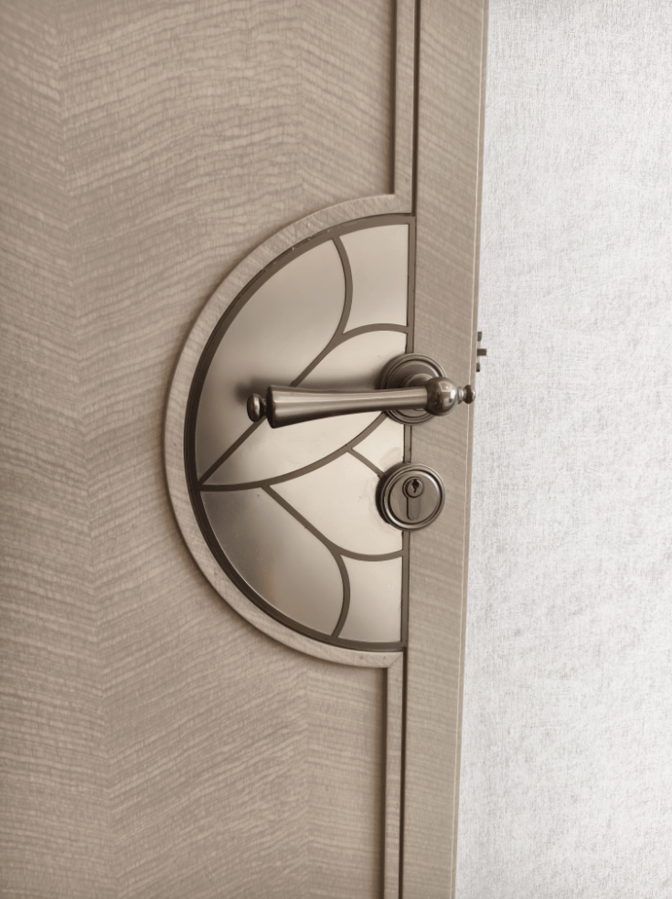 再来看玻璃移门,极窄边上吊柜设计,玻璃花纹做了特殊化处理, 将项目logo演绎后纹入 ,同样的处理也在 空调风口、入户门和套内门 体现,提供了更高的仪式感,代表的是象屿业主的圈层文化。