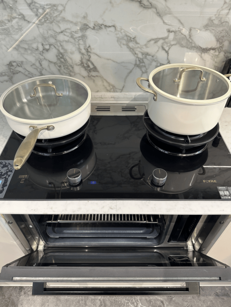在厨电品牌上,项目采用了方太 (或同等品牌) 四件套,包含了 烟灶蒸烤及洗碗机 。方太烟灶联动,可挥手感应。象屿配置的方太厨电, 均为市面零售款,相比于一些进口大牌,方太的大吸力,对中式家庭更友好 ,可以更有效地处理爆炒带来的油烟。蒸烤箱的操作界面,也设置在台上,不用弯腰,非常友好。