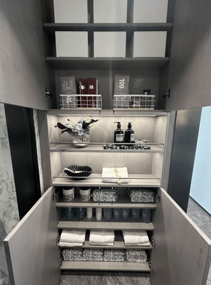 入户处,在当下常见的户型设计里,上图里的这个空间往往被作为冰箱使用,但实际上,冰箱与厨房的动线较长,使用并不方便。象屿的做法, 是在这里打造成了一个完整的“700库”。