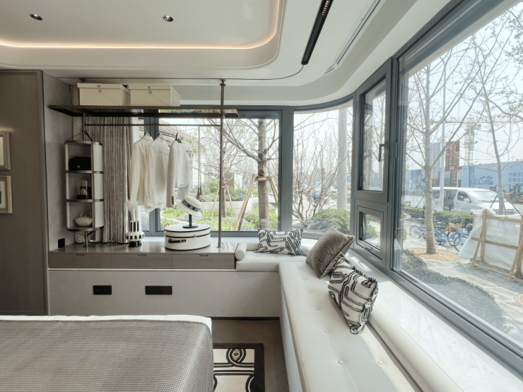 最后一处,是主卧。很多项目现在都做270°转角飘窗,但此前我们的直播间就 有粉丝吐槽,270°转角飘窗做满之后,主卧没地方打柜子。