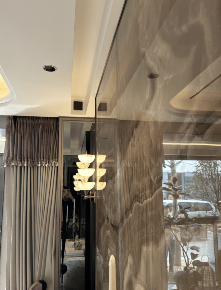 客餐厅+卧室弧形吊顶+内置灯带,施工难度大、工艺要求高,费时费力,但比直角吊顶,设计感直接拉满。 电视机背景墙同样为交付标准,玉石拼合岩板更显温润✅✅今日最新官方热线 象屿天宸雅颂售楼处电话:400-833-6309(官方售楼处电话)。