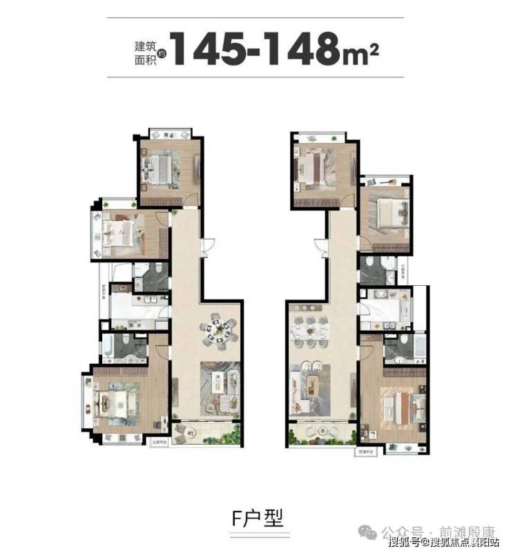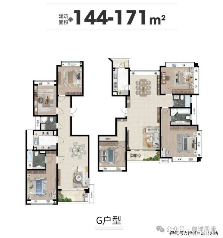 ③ 172㎡四房两厅三卫:高端改善户型,总价约1000-1238万,超大横厅设计,客厅宽度达约4.65米,主卧宽约5.1米,超宽阔尺度提升居住舒适度,还有超大采光窗户加全卧室飘窗设计,主卧更带270度转角观景、采光,部分户型可饱览小区低密河景,适合高端改善家庭,彰显身份与格调。