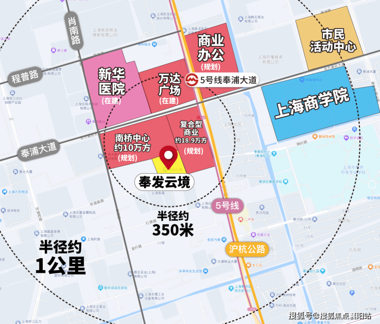 在奉贤所有置业优势里,交通通勤永远是排在第一位的核心,尤其是对于每天往返市区、闵行上班的刚需上班族,通勤时间长短直接决定日常居住幸福感,远郊很多楼盘宣传地铁房,实际距离地铁站超过一公里甚至两公里,步行耗时久、需要骑行接驳,早晚高峰风吹日晒十分不便,所谓地铁优势完全形同虚设。而奉发云境最大、最无法替代的硬核优势,就是直线距离 5 号线奉浦大道站仅 350 米,正常步行仅需 5 分钟,是板块内真正意义上步行直达的纯正地铁口住宅,没有水分、没有距离溢价,下楼步行即可抵达地铁站,是实打实的原生 TOD 住区。