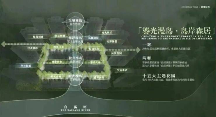 一环:24小时林荫漫步环,串联各大组团花园.两轴:约160m森系归家中轴,移步易景,营造尊崇归家礼序。活力共享趣味轴,多元交融的全龄森活场,境藏丰盛时光。