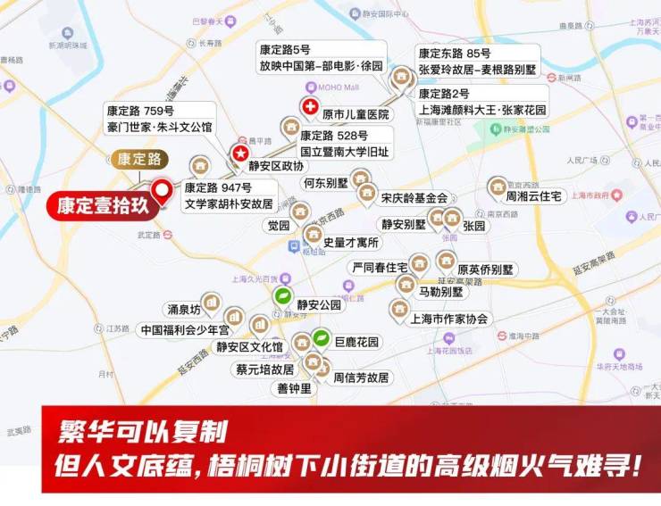老静安作为上海 “上只角” 的代名词,承载百年海派文脉与城市荣光,是上海公认的顶豪聚居区。项目扎根康定路百年梧桐区,周边环绕百年法桐与海派洋房,步行范围内遍布历史保护建筑与名人故居,文化底蕴深厚。同时,项目占位静安寺与曹家渡双商圈交汇核心,直线距静安寺约 1 公里,步行 12 分钟直达,1 站地铁即达南京西路,尽享 “全球奢品 + 高端商务 + 文化艺术” 全维顶奢配套,是内环内不可再生的城芯绝版地段。