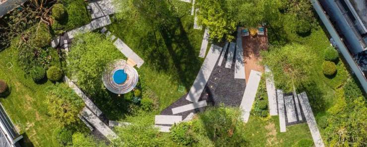 中岛水景, 池底采用蓝钻花岗岩和阿尔卑斯灰仿石砖拼花定制星语言铺地,包括两边景墙立面选用高端的爱马仕灰奢石,彰显出顶级石材的大气典雅。包括景墙转角的弧面,工艺难度非常大。