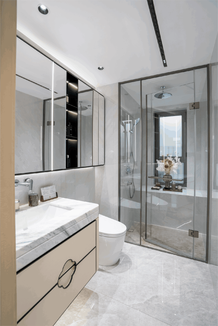 卫生间台面则选用 石材 ,进一步提升空间精致度。