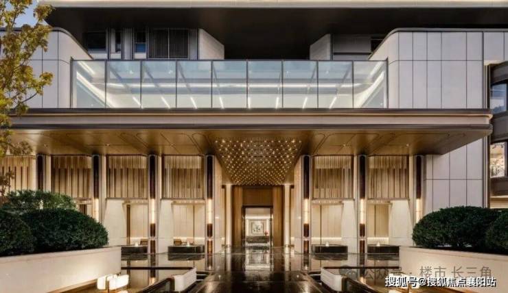 以社区北侧主入口的「鎏金」序厅为例,其设计便足以窥见公区的品质匠心:序厅总挑高约6米、总展面达30米,开阔尺度尽显气派;北向一字排开的 8根华之柱 ,采用古铜色复古肌理双曲面 铝板 打造,搭配 奢石 材质,更以 毫米级钻石切割工艺 为石材勾勒出多层次立体镶边,精致感拉满。