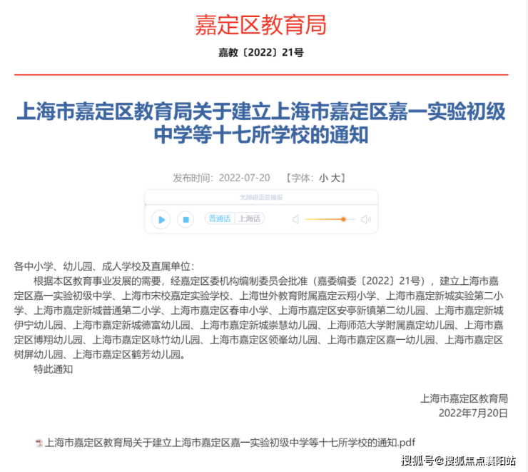 首先,据上海市嘉定区教育局官网发布:上海市嘉定区教育局关于建立上海市嘉定区嘉一实验初级中学等十七所学校的通知。