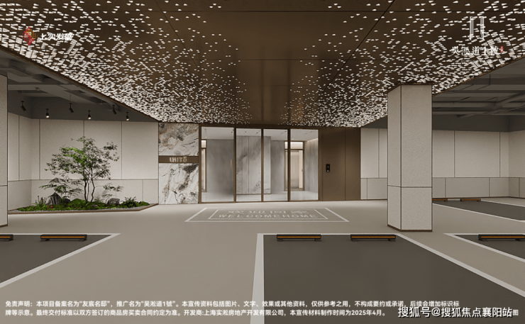 当多数地库还停留在满足基础功能性阶段, 吴淞道1號已将车库升维成艺术归家剧场 。相比传统车库窄车道与压抑管线外露设计,项目以 宽阔车道搭配格栅吊顶 ,利落线条消解逼仄感,行车视野更开阔,会车更轻松从容。