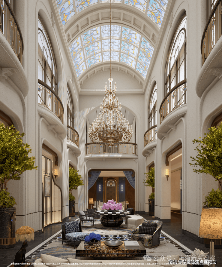 示范区以“玉兰门庭—迎归大堂—莳花荟”为核心轴线,运用非遗技艺与奢贵石材打造。约65米长玉兰门庭融合海派元素,9米挑高迎归大堂,汇集多位艺术家跨界作品,莳花荟中央会客厅再现海派社交场景。