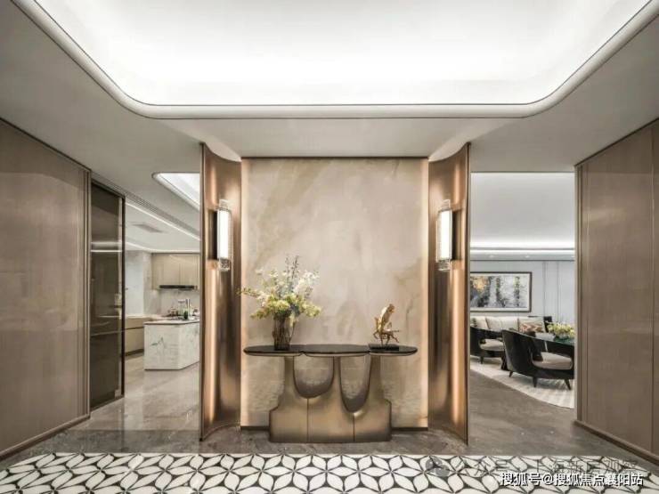 「玉兰门庭」摩登飘逸,环抱式落客前场,大师定制非遗掐丝珐琅门钹,流转温润光华,敬呈归家尊崇礼序,自此启幕生活的华贵序章。