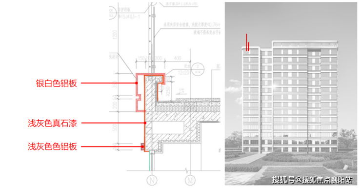 色彩提炼 :米白色真石漆与浅灰色铝型材,抽象提取“粉墙黛瓦”的色彩关系。