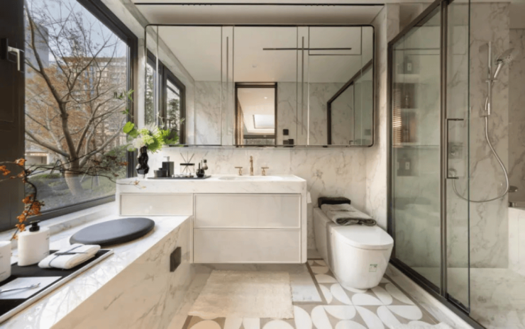 卫生间采用杜拉维特 (或同等品牌) 的台盆、汉斯格雅 (或同等品牌) 的花洒五金件、主卫伊奈、次卫恩仕 (或同等品牌) 智能一体马桶。