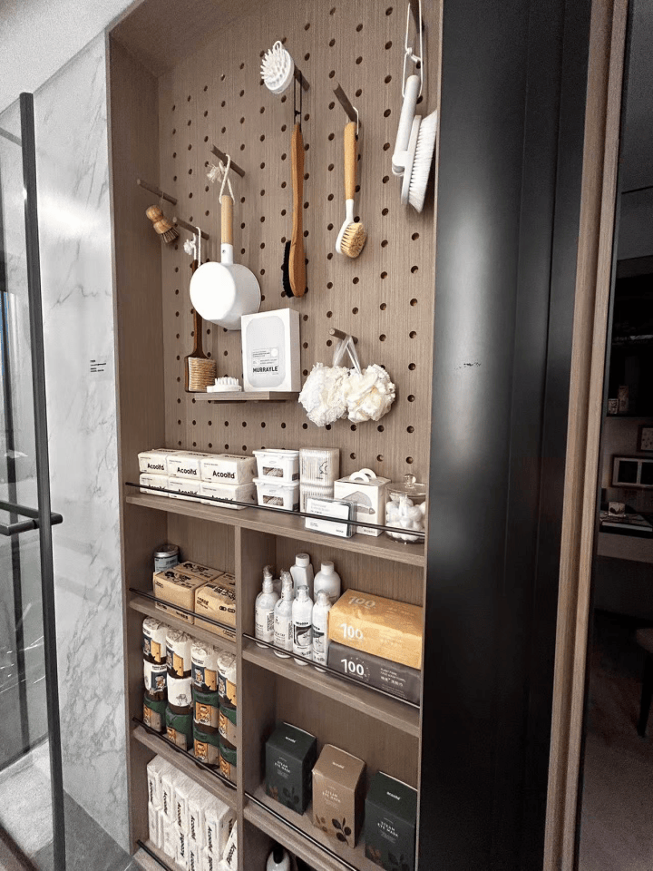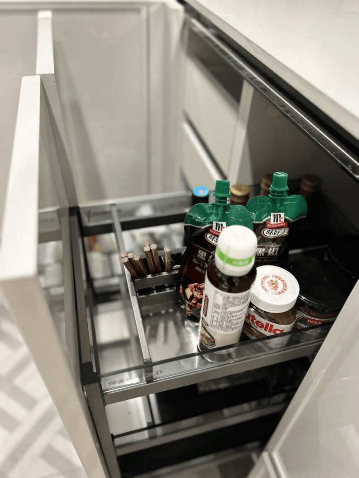 可抽拉的零食柜、厨房抽屉式碗碟拉篮、包括卫浴的收纳墙,于细节之处见真章。