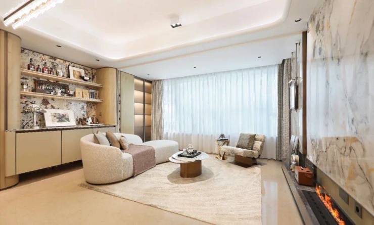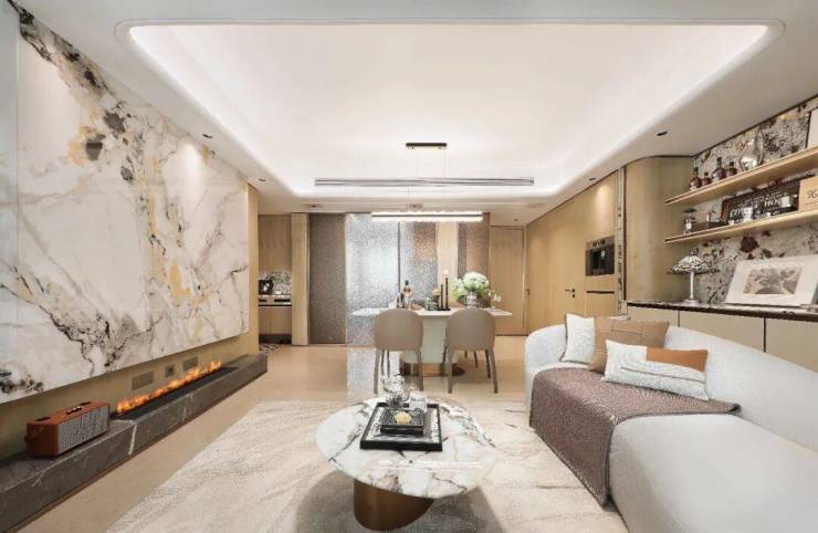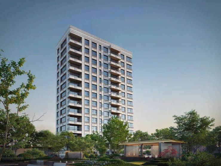 建筑立面采用 巴西进口白世贸石材全干挂 ,搭配三玻两腔双 LOW-E 外窗,公区及入户大堂运用香格里拉黑、奥特曼米黄等十余种珍稀奢石,呈现宝格丽级奢雅质感。15-17 层小高层挺拔大气,线条流畅简洁,无连廊设计,最大化保障采光与通风,金属线条与石材肌理碰撞,兼具现代感与高级感,成为中环一道靓丽建筑风景线。