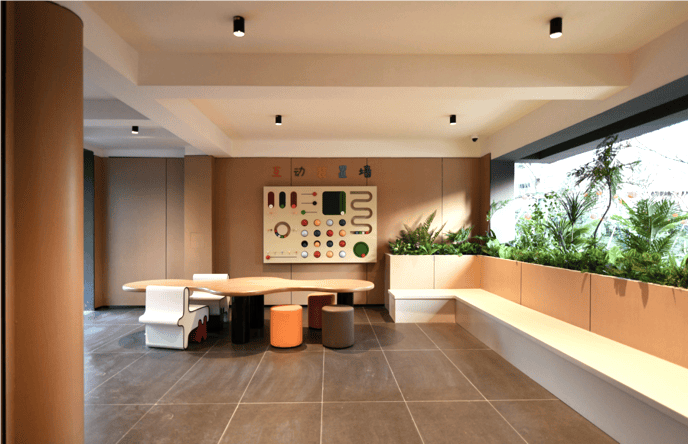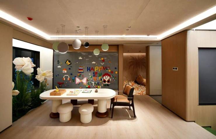 园林内规划儿童游乐区、老年活动区、健身跑道、阳光草坪、邻里社交区等全龄活动空间,满足不同年龄段业主的休闲需求。儿童游乐区配备安全环保的游乐设施,色彩缤纷、趣味十足,让孩子尽情嬉戏玩耍,释放童真;老年活动区设置休闲座椅、健身器材、棋牌空间,为长辈提供舒适的社交与健身空间,安享晚年时光;约 800 米环形健身跑道,串联园林各个节点,业主可随时开启健康运动模式,享受活力生活;阳光草坪与邻里社交区,为业主提供休闲聚会、亲子互动的场所,增进邻里感情,营造和谐友爱的社区氛围。邻里交互空间