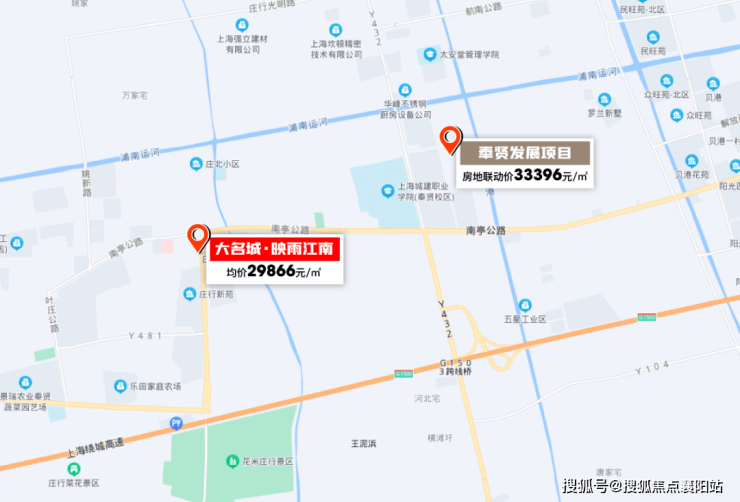老闵行价格已达到5.9万/㎡,奉贤新城价格也在4万/㎡+,大名城·映雨江南均价29866元/㎡,价格差非常明显。