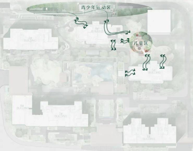 室内外无界渗透, 青少年运动场、宅间花园、儿童乐园 与架空层的无界联动体系,打造无界交流共享空间 , 弱化交界面,室内外共享 , 形成园区功能互通; 从儿童到青少年到成年人的全龄无界互通