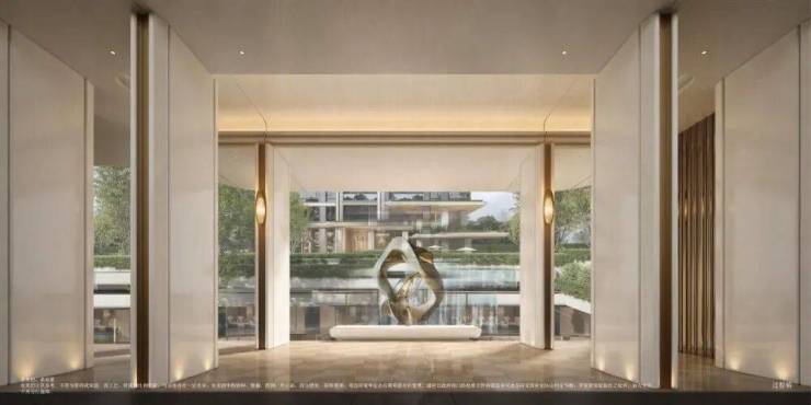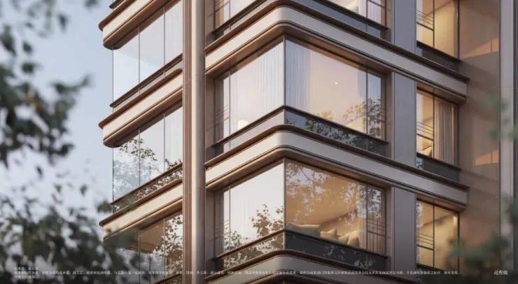 保利·江上印建筑外立面采用 底座石材 ,东南西三面第一眼界面 全铝板 和 玻璃幕墙 ,顶部鎏金塔冠点缀,实现 “ 四面平权 ”,在区域内实现了最高级的内透美学