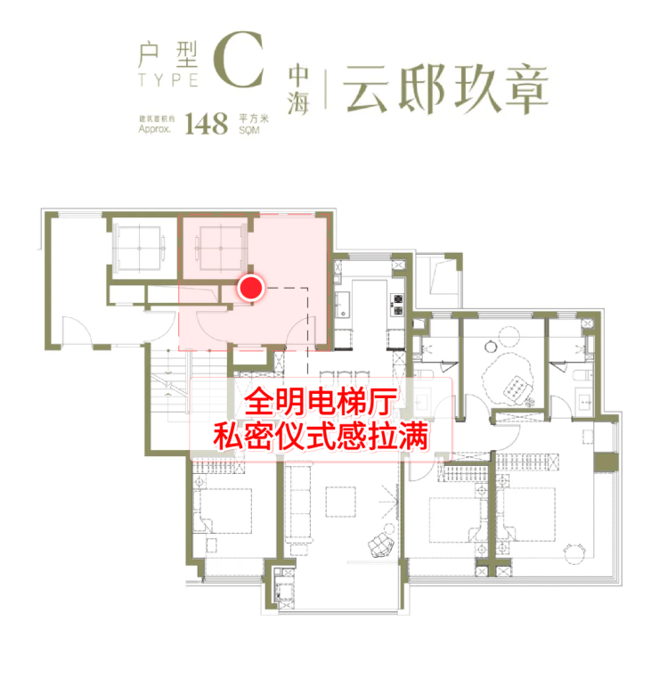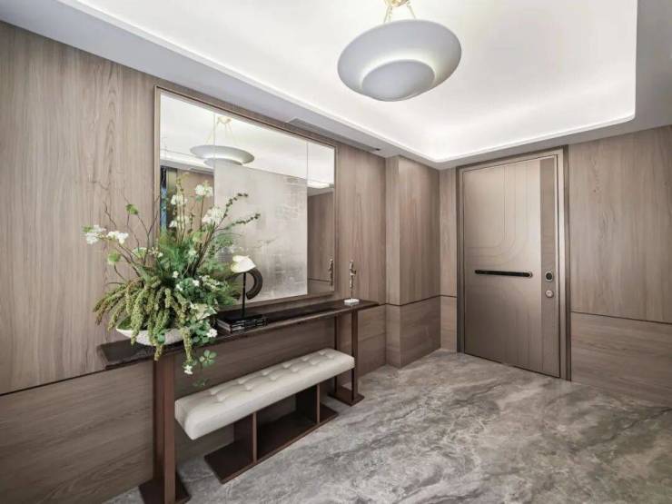 该户型外部呈 类一梯一户设计 ,将近10㎡的电梯厅空间成为家的延伸,配合门内玄关形成内外双玄关格局,大幅度提升了居家的私密性和仪式感。