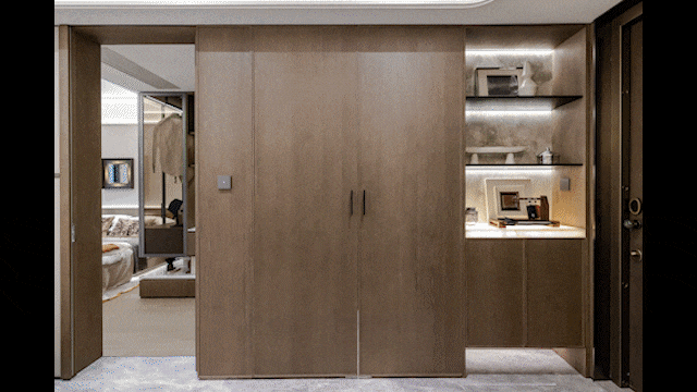 过道的空间也得以充分利用 , 一整面的过道柜,可作为各类消耗品的收纳中心,如果你是一个爱购物、收藏的业主,在这里,双十一囤再多货也都能放下。