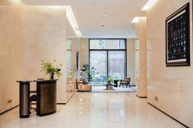 栋大堂挑空超过5米,非常通透明亮, 墙面地面基本都是石材铺设,挂了艺术装饰,归家品质感很高。