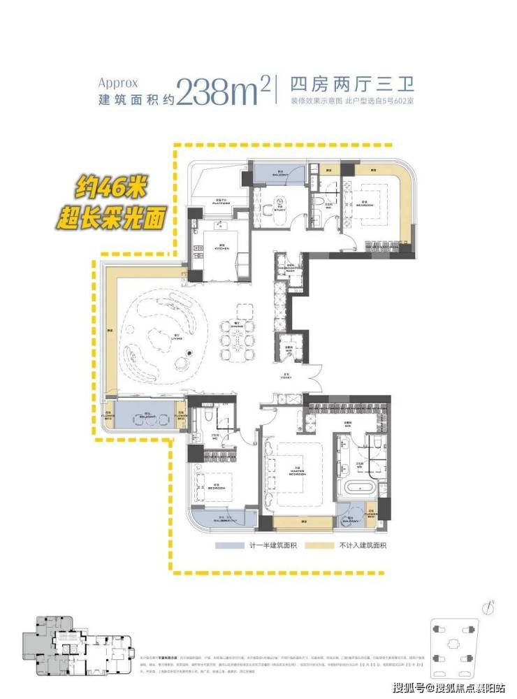 重点说一下几个爆款户型,都是当下高净值人群追捧的热门款。建面约238㎡四房两厅三卫户型,全屋采光周长约46米,客厅是连续约17米的三面采光界面,不管是白天还是晚上,室内都特别明亮通透;南向设置双主卧套房,各自配备独立卫生间和衣帽间,私密性和舒适度拉满,而且全屋设有六处系统化收纳空间,杂物再多也能轻松收纳,实用性极强。