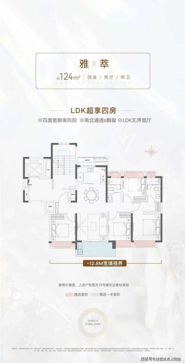 核心亮点四开间朝南,南向面宽约 13.2 米 ,采光视野双优; 约 5.6 米宽厅 ,连通南北双阳台,通风采光效果极佳; 双卫设计 ,客卫干湿分离,主卧套房带独立卫浴与步入式衣帽间,满足改善家庭私密需求; LDK 一体化设计 ,客餐厨阳台联动,空间通透大气,适配家庭社交、休闲、办公多元场景; 双飘窗 + 阳台赠送 ,实际使用面积远超建筑面积。