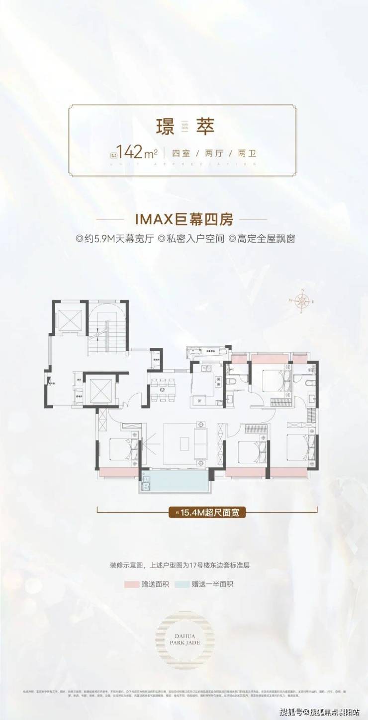 核心亮点四开间朝南,南向面宽约 15.4 米 ,IMAX 级采光视野; 约 5.9 米阔尺宽厅 ,连通双阳台,空间开阔大气,适配家庭聚会、休闲、办公多元场景; 双套房设计 ,主卧带独立卫浴、步入式衣帽间,次卧均带全景飘窗,满足三代同堂私密需求; LDKB 一体化设计 ,客餐厨阳台书房联动,空间灵活改造,适配家庭成长需求; 半赠送阳台、全赠送飘窗 ,实际使用面积最大化,得房率达 85%。