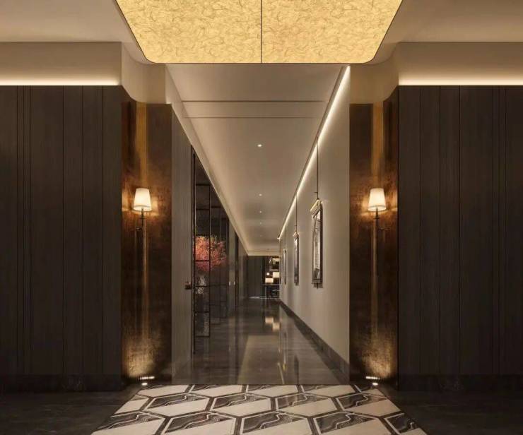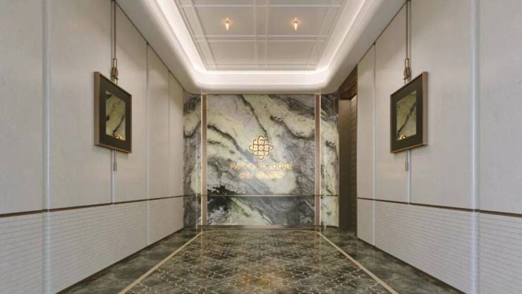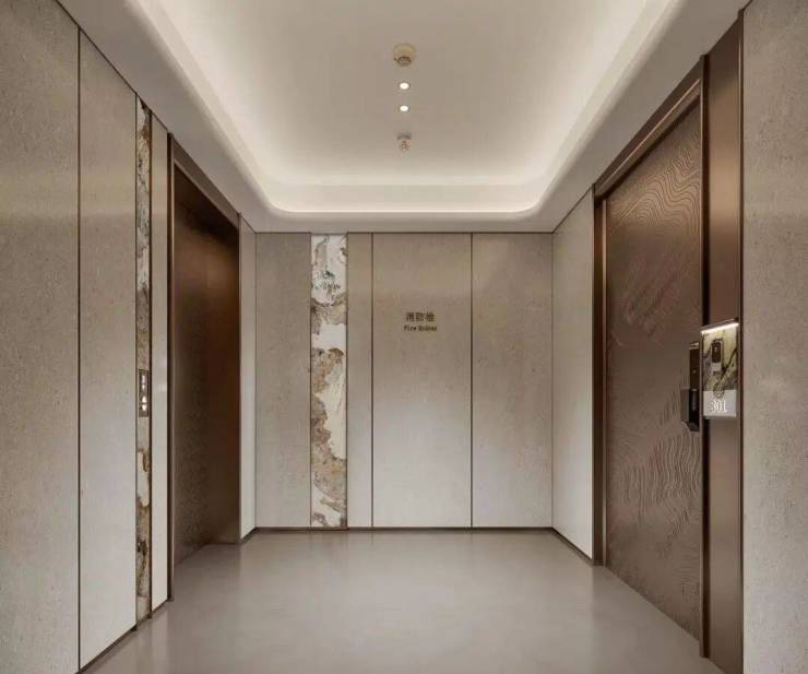 电梯厅融合 梵高印象岩板 与超白洞石大面积的铺装,彰显出了细腻雅致!