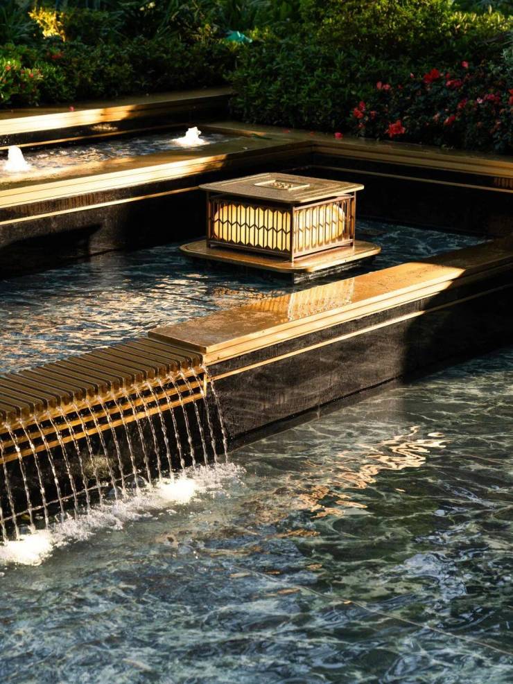 大堂地面也采用金世纪 水刀拼花工艺 与 香格里拉黑大理石 ,辅以莫奈花园奢石背景墙,营造了非凡的气度。