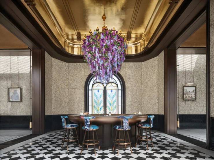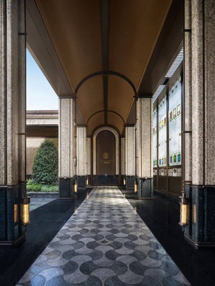 走进落客区,头顶美轮美奂的约300㎡彩色玻璃穹顶,灵感来自于和平饭店,融入老洋房PRADA荣宅的特殊徽章转译。其中 水波纹玻璃、镶嵌玻利维亚蓝奢石 带来了丰富的层次感,光影相间的繁复感,仿佛让人步入时光长廊,这样充满艺术性的归家礼仪,让人一眼着迷!