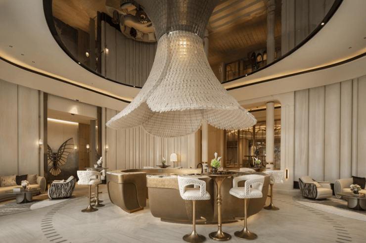 除了特色功能区,奕CLUB还打造了多个全维度社交休闲空间,满足业主的多元需求。会客厅承载着“私人空间之外的延伸场景”,打造了标志性的“羽化万象”艺术吊饰,每一片玻璃羽毛造型都由经验丰富的老师傅手工搭建而成,光影流转间,构筑出极具美学感的空间,适合商务洽谈、亲友小聚。