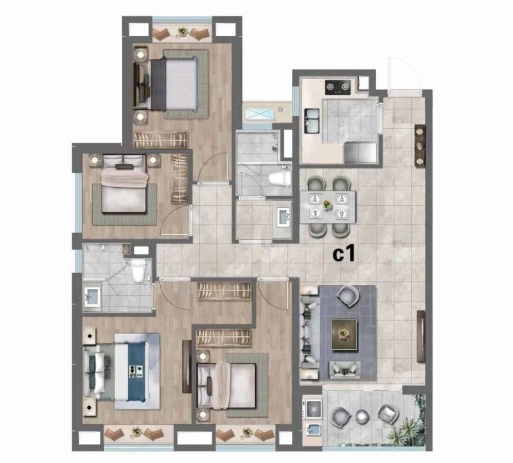 建面约127㎡四房两厅两卫,三开间朝南+三卧室带飘窗+主卧套房设计+卫生间干湿分离+动静分离+南北通透,功能非常齐全的4房户型。