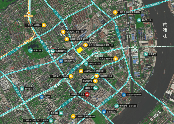 地块东至上师大附属杨浦滨江实验小学,南至顺平路,西至内江路,北至内江公寓,出让面积14958.66㎡,容积率2.5。