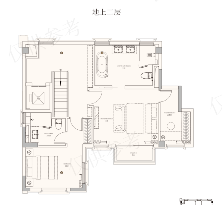 地上二层 :静谧起居层,双卧室套房设计,带独立卫浴、全景飘窗,空间开阔、私密性强,适配家族成员居住需求。