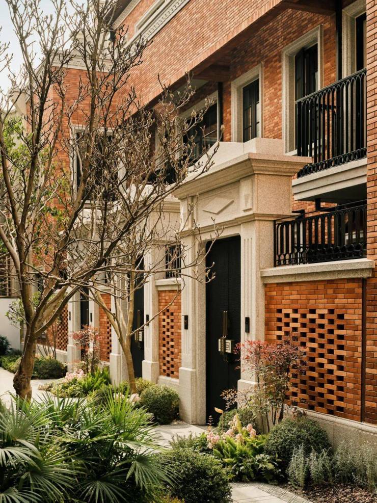 瑞安翠湖滨江以 传统海派里弄建筑 为设计灵感,由国际顶尖大师团队联袂操刀,传续上海百年建筑文脉,以当代笔触打造 “新海派风貌别墅”。建筑立面采用 红砖、水涮石、石库门、山花、山墙、铁艺栏杆 等经典海派元素,创新融合 8 种不同风格立面,红砖白缝勾勒、细节精致考究,兼具历史质感与现代美学。