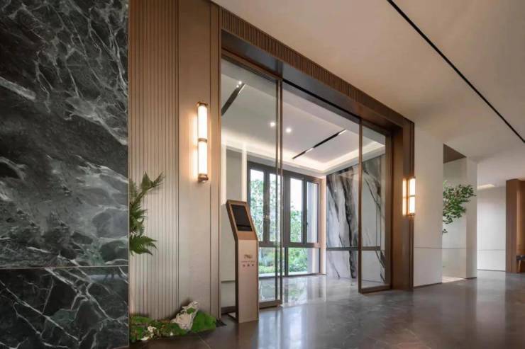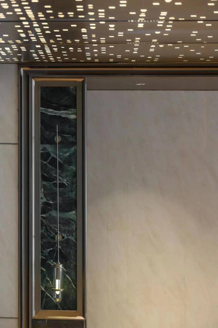 架空层入户门厅处,以普拉达绿奢石为背景装饰,提升了整体空间的质感,结合金属铝板装饰搭配,归家仪式感满满。