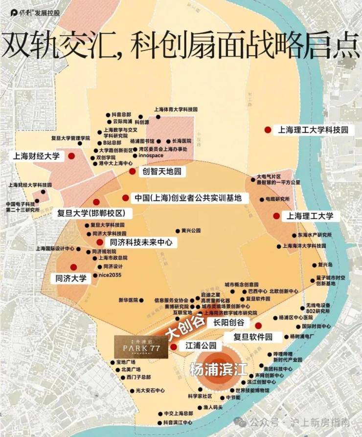 科创、文教、金融三大极核的环伺,更让保利外滩启park77的价值再升一级。项目所在的杨浦滨江,以江浦公园为支点,展开5公里科创扇面,北望4公里是百年复旦,向西3公里是同济巍然,东南5公里是上海理工,汇聚上海最密集的高校智力资源,形成浓厚的科创氛围与高知圈层生态。同时,项目1站地铁直达大连路总部集群与长阳创谷,大连路总部集群定位外企、央国企总部园区,集聚世界500强企业技术研发与地区总部;长阳创谷是上海乃至全国创新创意产业的新高地,聚集超2000家企业,科创能量持续爆发,大量科创精英、行业高管在此工作生活,为项目带来了旺盛的高品质居住需求,也奠定了纯粹的高端圈层基础。