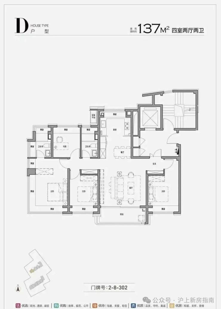 建面约137㎡四房两厅两卫,是高阶改善的主力户型,空间阔绰,布局合理,能够满足二孩家庭或三代同堂的居住需求,彰显居者的身份与品味。户型采用270°全景舱设计,部分户型通过北/南/西三向展开近36米连续玻璃幕墙,西南向无遮挡,城市盛景与公园绿意一览无余,让居者随时随地都能享受极致的景观体验;客餐厅、厨房、阳台一线贯通,空间通透感十足,搭配入户玄关设计,既保证了私密性,又提升了空间的格调,可容纳多人聚会,彰显主人的待客之道;主卧套房设计,配备独立卫浴、步入式衣帽间和观景飘窗,私密性强,舒适度高,每天清晨,被阳光唤醒,推开飘窗,即可欣赏园林与江景美景,开启美好的一天;三个次卧空间宽敞,可作为儿童房或老人房,还可设置专属书房、茶室,灵活多变,满足家庭的不同需求;双卫生间设计,干湿分离,兼顾了便捷性与卫生性,避免了家人洗漱的拥挤,提升了生活的品质。