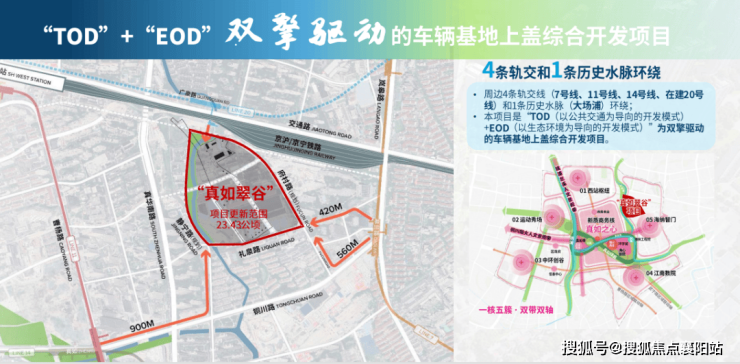 项目地处真如副中心东部,更新范围约23.43公顷。项目以“TOD(以公共交通为导向的开发模式)+EOD(以生态环境为导向的开发模式)”为双擎驱动的车辆基地上盖综合开发项目,紧邻东侧轨交7号线岚皋路站和北侧轨交20号线广泉路站(在建)。