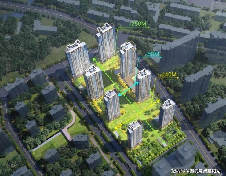 尤为引人注目的是 约50米横向楼间距 ,这一尺度远超常规住宅项目,在小区内部嵌入一座相当于小型城市公园的公共空间,光是看效果图就能感受到。