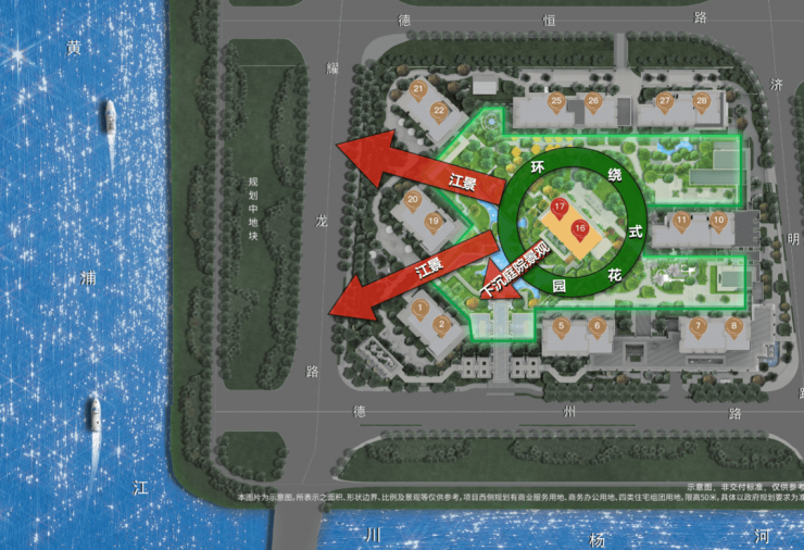 项目向北是地标级的世博文化公园,向南是前滩友诚公园和休闲公园,对岸是规划中的西岸中央公园,把他们串联起来的是长18公里的滨江岸线,包括 跑步道、漫步道、骑行道,还有约20万方亲水平台!