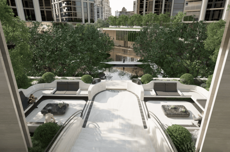 穿过园林,上海最大的 约3500㎡下沉水院构成社区的核心灵魂, 约13米的高差形成独特的“峡谷绿洲”,将黄浦江的水意象引入社区,中央平静水面与四周的会客舱、茶室、游泳馆形成呼应。