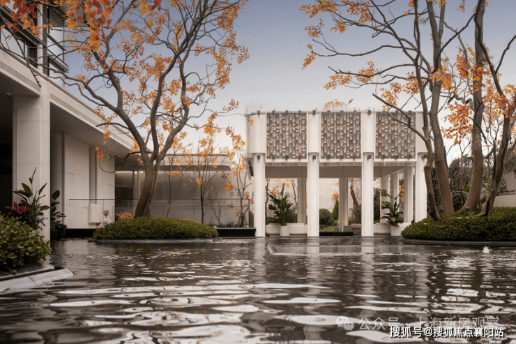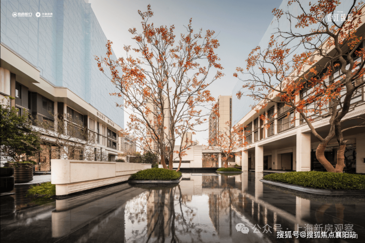 超千方镜面主题水院,时刻演绎自然与建筑的无界之美: 澄澈镜面水面倒映建筑肌理与天光云影,搭配三株原生丛生乌桕的点缀,与回廊、浮岛相映成趣,营造出静谧雅致的亲水意境,这种沉浸式水景体验生活,在张江高端住区中尤为稀缺。