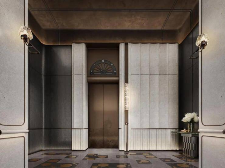 电梯厅的 宠物识别按钮 是艺术家定制款;入户门把手出自艺术家刘建华之手,用 整块实心铜锭经锻造 、打磨、电镀等多道精密工艺制成,握住的瞬间就是与艺术的触碰