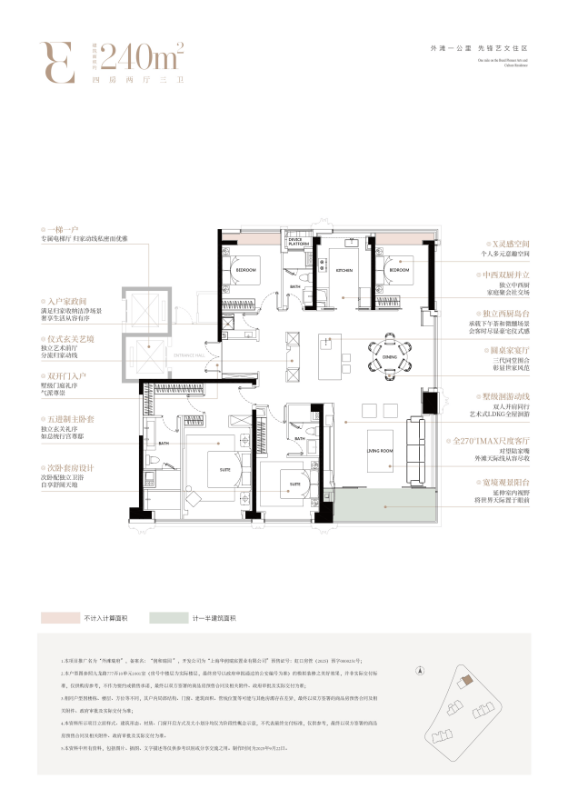 项目占地面积约 14280.63㎡,地上总建筑面积约 55266㎡,容积率 3.87,绿化率 35%,整体规划 4 栋 24-32 层高层住宅,搭配少量风貌商业与社区配套,总户数仅 320 户,车位配比达 1:1.35,共配置 482 个地下车位,充分满足高端业主泊车需求。低密布局与纯粹圈层规划,让每一户都能享受静谧的居住环境,是上海城央不可多得的 “世外桃源”。