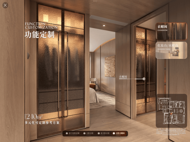 甚至还有功能定制,以240㎡主卧衣帽间为例,提供 整体收纳、化妆台、水吧台 等多种布局,精准贴合个人生活习惯。